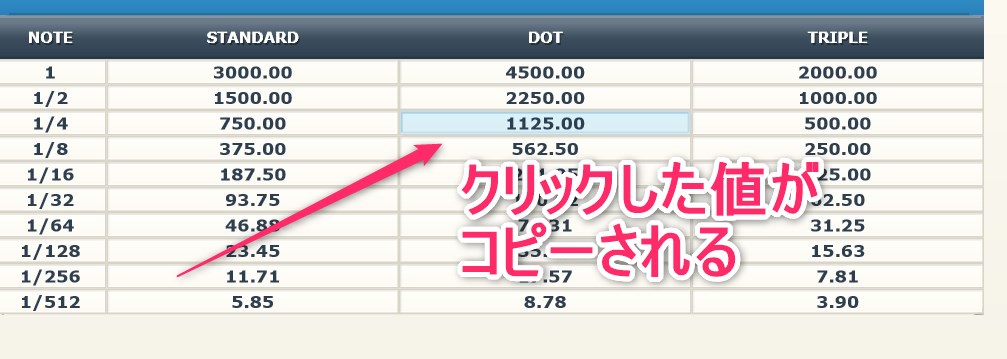 ここには、4分音符、8分音符、16分音符、さらには付点や三連符に至るまで、その楽曲のテンポに同期した正確なミリ秒数が一覧となって並びます。
