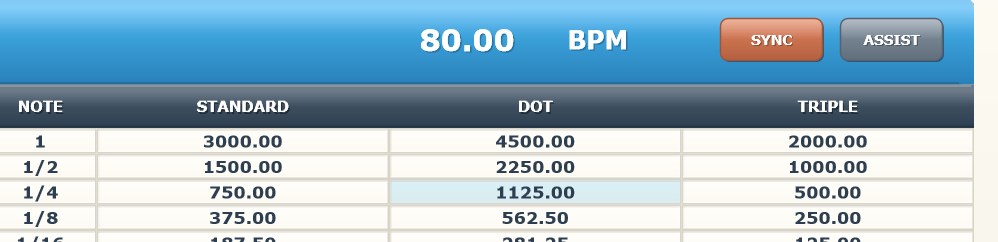 ステップ1:DAWのBPMと同期させ、アシストテーブルから音価を選ぶ