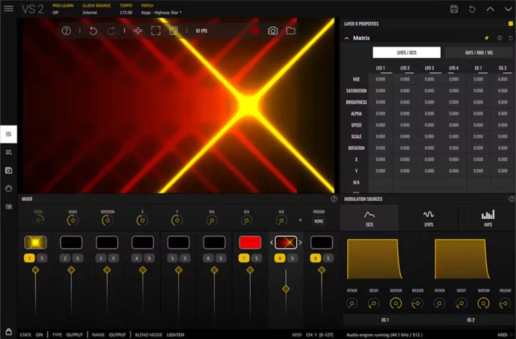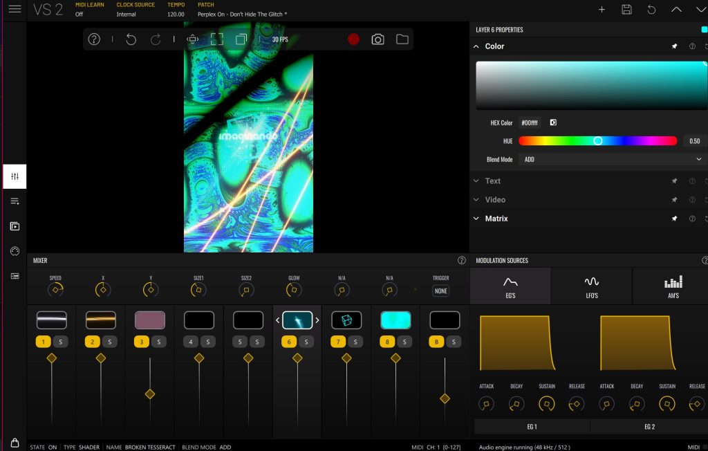 なんでImaginando VS-2を選ぶかって? 他のツールは技術者向けでハードル高いけど、こいつはミュージシャン目線で設計されてるから、直感的で楽しいんです。最大の魅力はパワフルなモジュレーションシステム。2つのエンベロープジェネレーター(EG)、4つのLFO、4つのオーディオモジュレーターで、ビジュアルをダイナミックにコントロール。音のピークや周波数帯に反応させて、まるで生き物みたいに動かすんですよ。