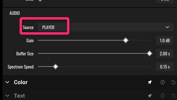 右側のメニューの INPUT > AUDIO で Source をプレイヤーに選択。