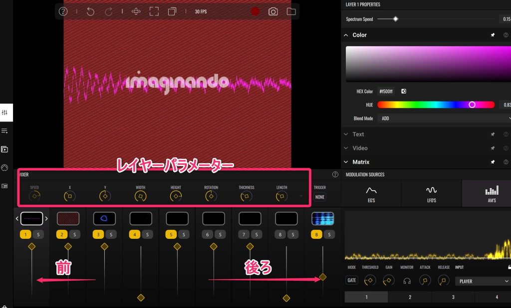 具体的に言うと、シェーダー(特殊効果みたいなの)、画像、ビデオ、テキストをレイヤー重ねて、LFOやエンベロープでアニメーション付けられるんです。