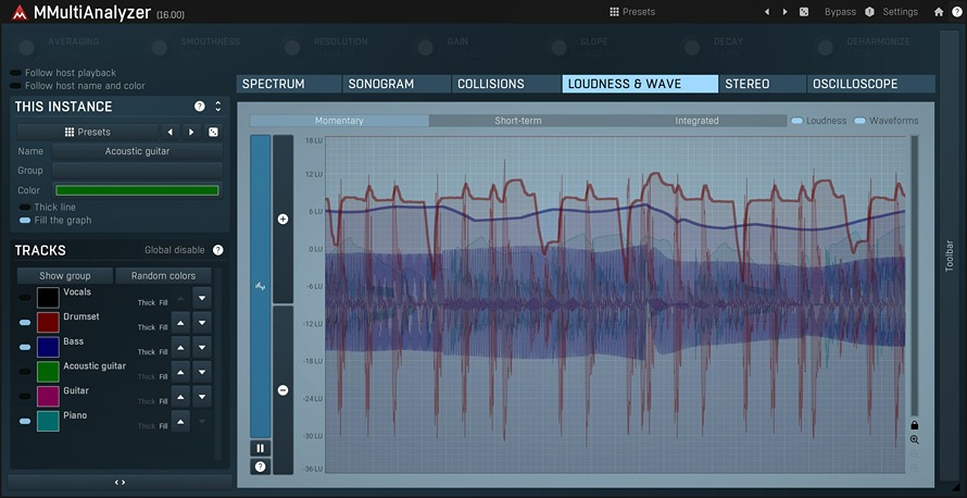 - インスタンスを各トラックに配置 – 例えば、ドラム、ベース、ギター、ボーカルそれぞれに MMultiAnalyzer を挿入。