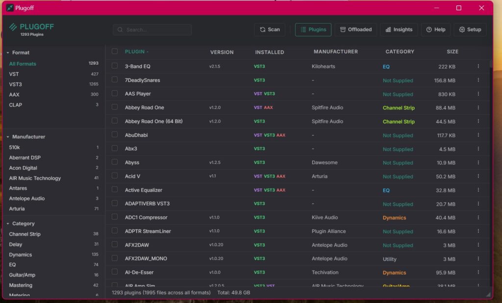 Plug-Offは、macOSおよびWindows上のすべての主要プラグイン規格をスキャンし、一括管理できるスタンドアロン・アプリケーションです。