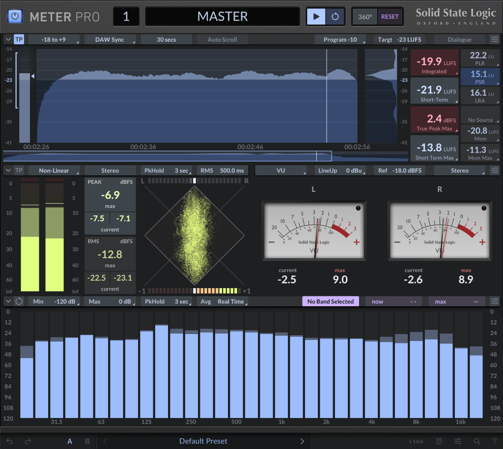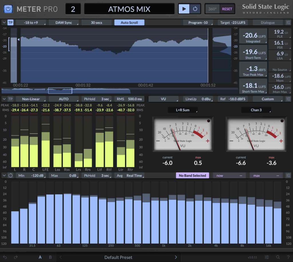 SSL Meter ProではピークレベルとRMSレベル、位相コヒーレンス、ステレオバランス、周波数成分の測定機能を備えています。