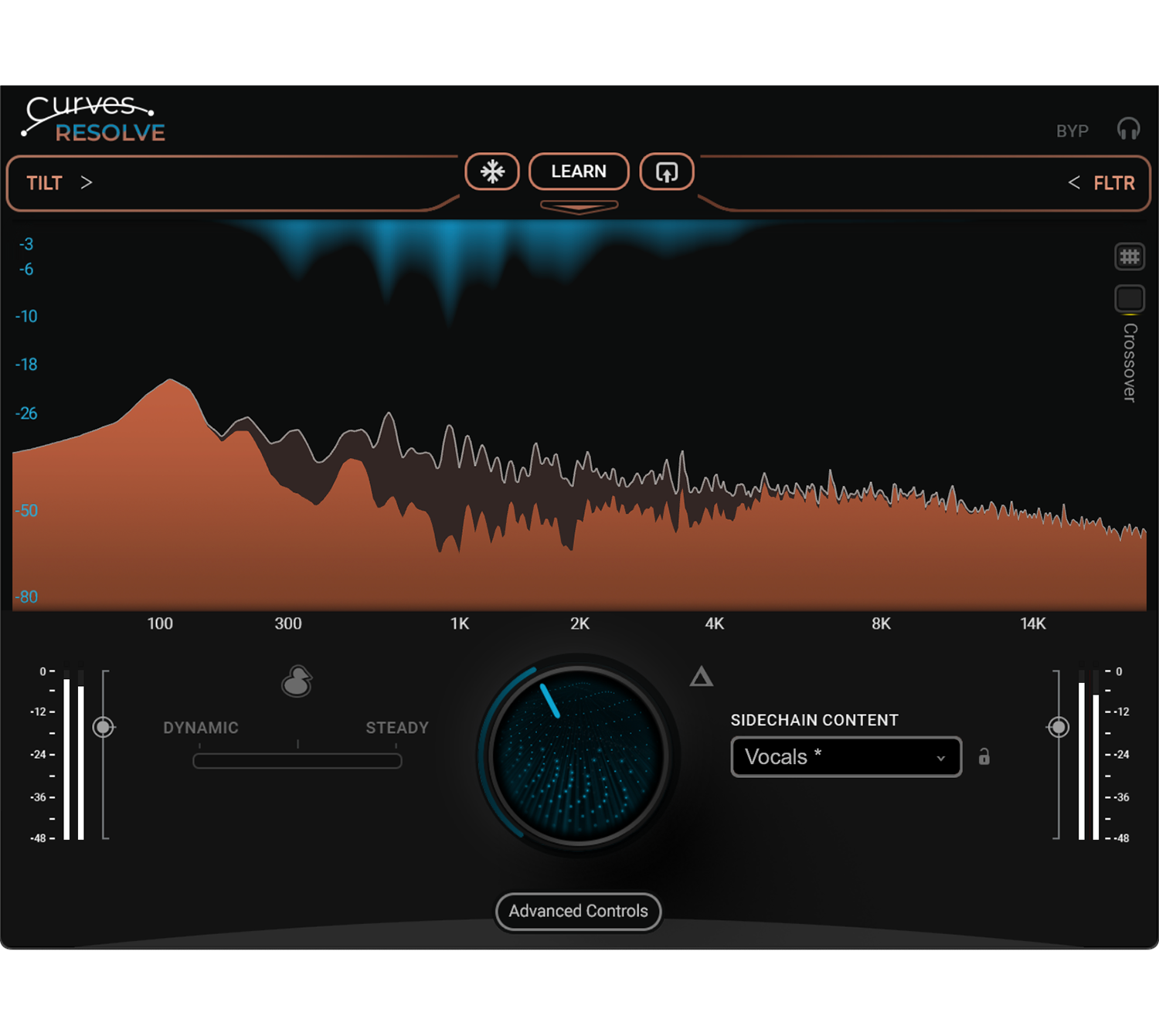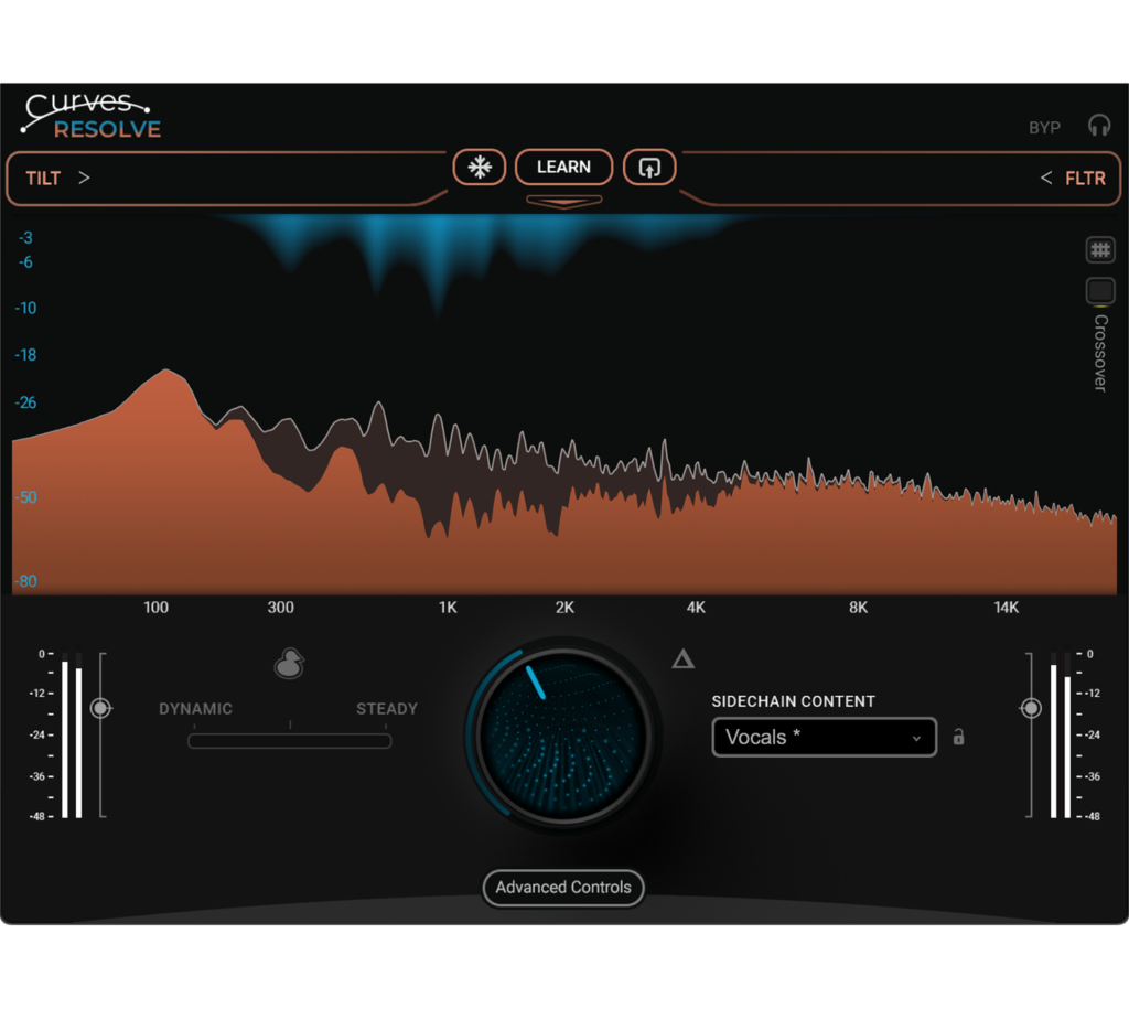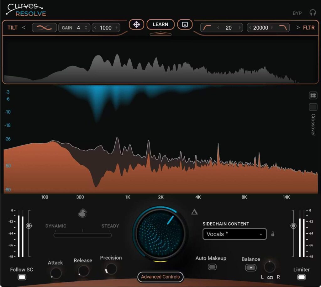 Curves Resolveが単なる自動処理プラグインと一線を画すのが、サイドチェイン信号に対する高度な調整機能です。 「Sidechain Filter」を使えば、プラグインが反応する周波数帯域を絞り込むことができます。 例えば、ドラムバス全体をサイドチェインソースとして使う場合、シンバルの高域には反応させず、キックとスネアのアタックだけに反応させたい、ということがあります。 その場合、Filterで高域をカット(ローパス)してしまえば、Curves Resolveは低中域のエネルギーだけに反応してリダクションを行うようになります。 また、「Tilt」機能も強力です。これはサイドチェイン信号の周波数バランス(スペクトルバランス)を傾ける機能です。 Tiltを「High」寄りに設定すれば、高域成分に対してより敏感に反応し、「Low」寄りにすれば低域重視で解析します。 ボーカル処理において、「声の芯」よりも「ブレスや空気感」の方を避けるようにしたい、といったマニアックな要望にも、このTiltを調整することで応えることができます。 これらのパラメータを駆使することで、自動処理の便利さを享受しつつ、エンジニアの意図を反映した細やかなコントロールが可能になります。自動化と制御の絶妙なバランスこそが、Wavesの神髄です。