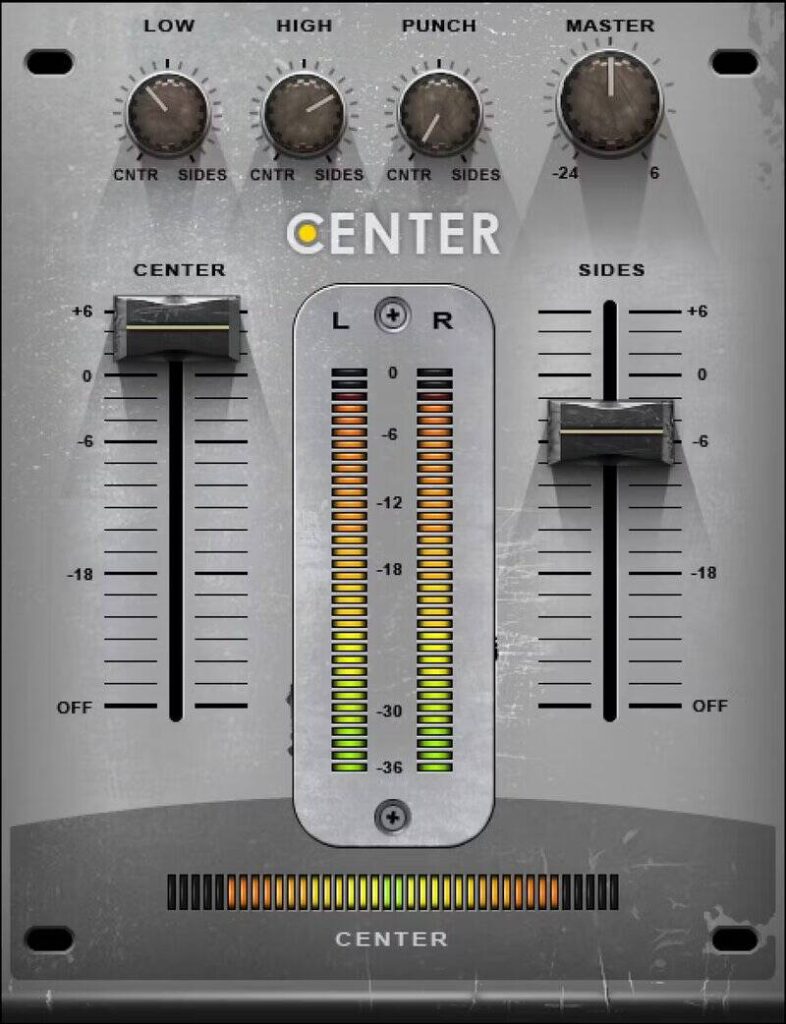 Centerは、ステレオ音源の中央(Center)と両端(Sides)を分離して個別にコントロールできるプラグインです。完成された2ミックスからボーカル(センター)だけを少し浮かせる、あるいは逆にサイドを強調して広がりを出す、といった高度なマスタリング・テクニックが、たった二つのフェーダーで実現できます。
